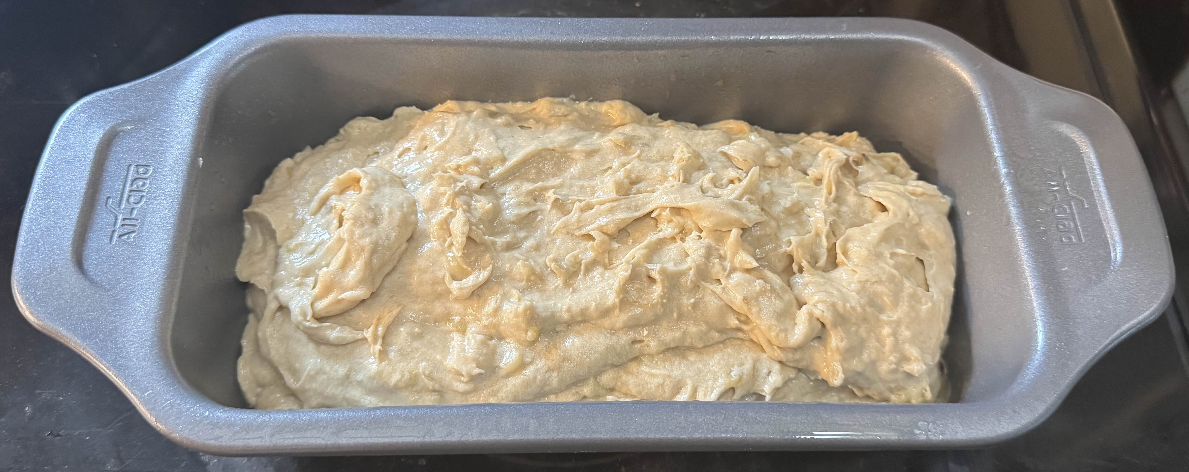 Pour batter into prepared loaf pan